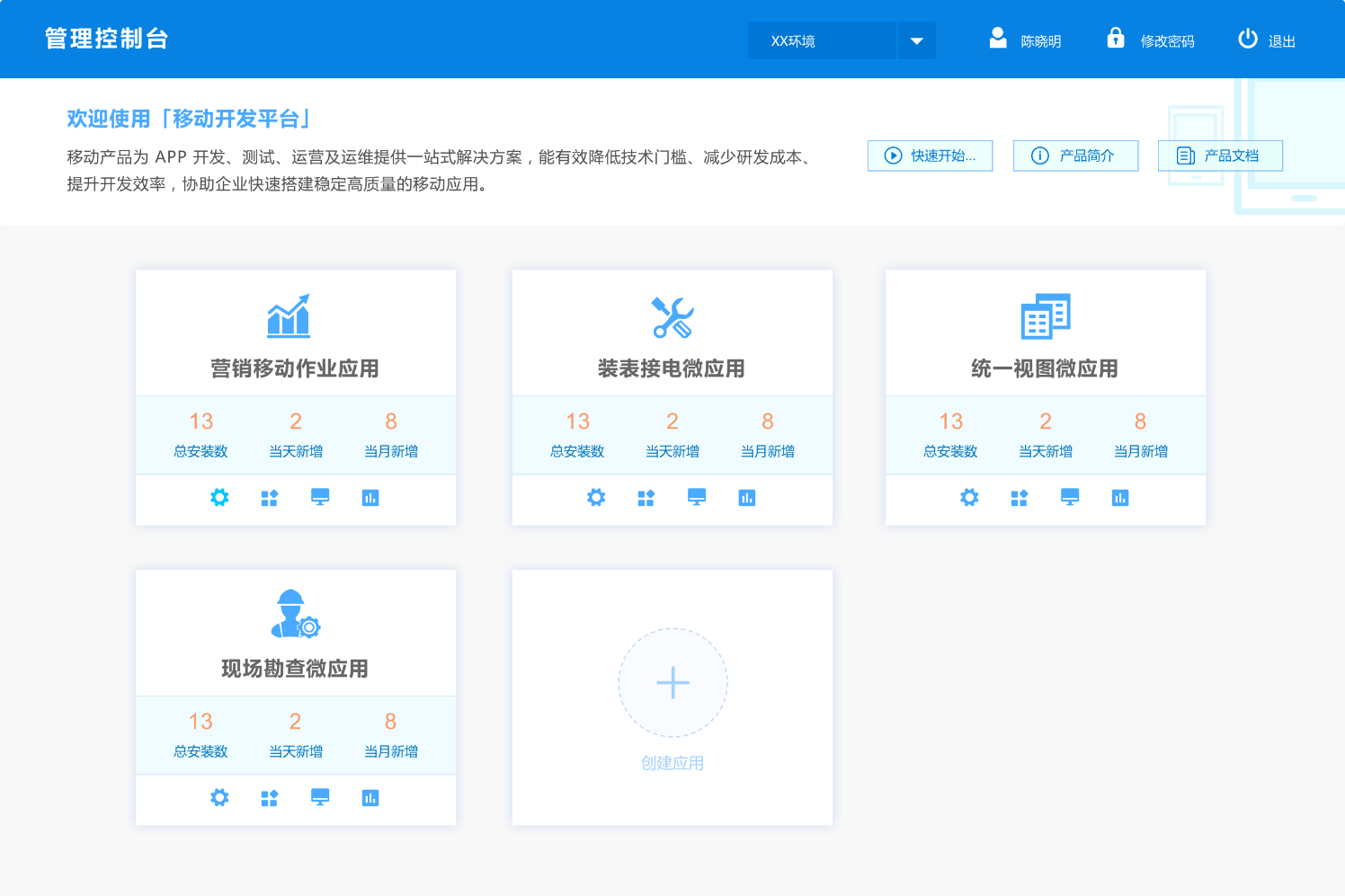 该产品是一个安全可靠、稳定、智能便捷的移动互联平台,为移动终端APP开发、测试、运营及运维提供一站式解决方案,能有效降低技术门槛、减少研发成本、提升开发效率,协助企业快速搭建稳定高质量的移动应用。平台支持业务接口适配,能够集成多业务系统;支持移动应用组件配置,能够跨团队,跨部门、跨公司进行模块化协作开发;支持移动应用发布,实现自动化版本发布、升级更新;支持移动设备管理、应用分析,对移动终端应用的日志、API、访问链路性能等实时监控分析;支持消息推送、服务管理,使得用户通过手机实时获取各类服务信息,提升电力服务能力。