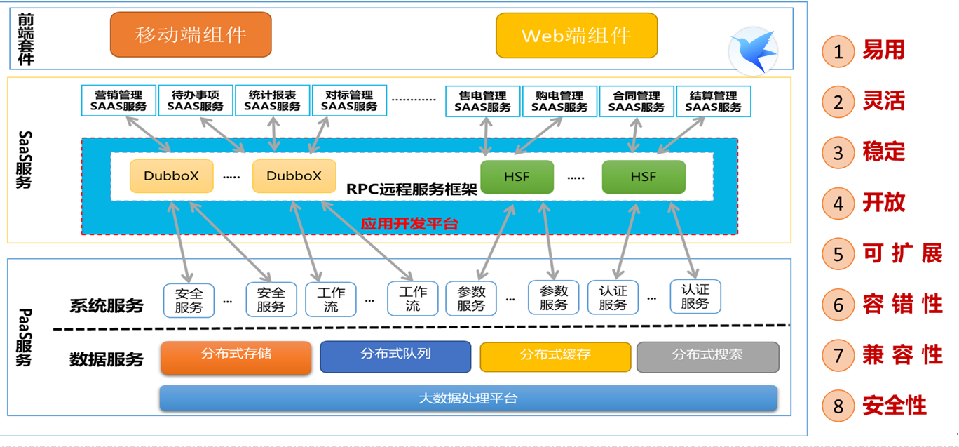 八项技术服务:平台提供工作流、任务调度、消息推送、邮件、报表、组织体系、系统参数、标准代码等八项集成技术服务。