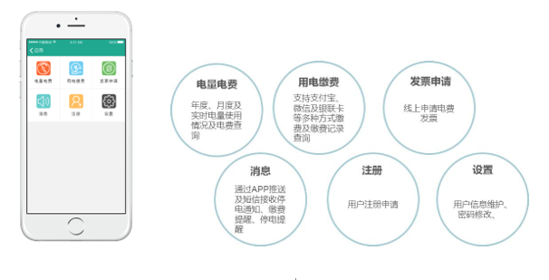 租户侧应用功能在微信、小程序、支付宝服务窗或移动APP端实现,更多服务渠道支撑,为租户提供24小时支付宝、微信、APP等电费账单、缴费、报事报修等随时随地便捷服务。
