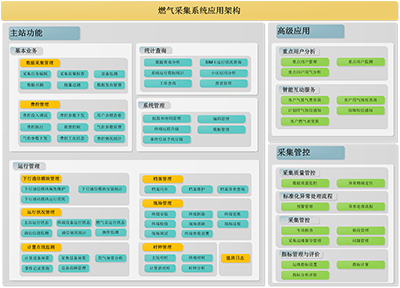产品功能包括基本应用、高 级应用、运行管理、统计查询、冬季保供、系统管理六大功能模块,采用与营销客户信息管理系统统一的标准代码和档案资料,强化参数配置管理、权限管理、日志管理、元数据管理和接口标准管理等运行维护;突出业务应用特点,特别在损耗监测分析、费控管理、生产协助、计量设备巡检、冬季保供、客户发展辅助、现场可视化管理等方面进行功能扩展;充分利用燃气采集系统覆盖面广、采集信息及时的优点,深入挖掘采集数据和设备资源价值。