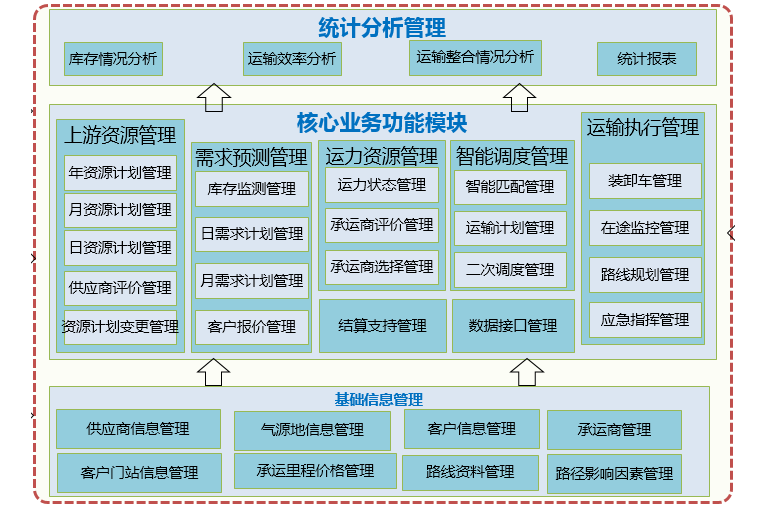 该产品以围绕资源保障,调度执行的两大核心流程,从客户的库存、需求情况出发,进行需求预测策略、自动补货模型、价格准确测算、到气源选择、运力采购管理,经过调度计划与运力合理匹配,形成运输任务后执行,采集相应磅单信息进行结算,完成整个LNG贸易智能调度过程。
