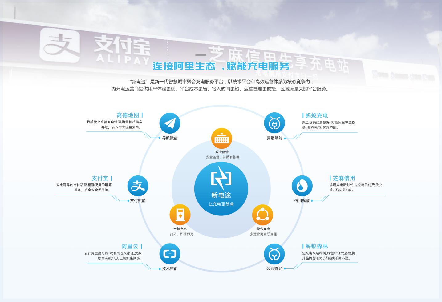 此外,新电途还联合支付宝、高德地图,实现一键扫码充电服务。引入支付宝 “花芝”(芝麻信用+花呗)体系标准,开启信用充电”新模式,新能源车主可在区域范围内支持支付宝扫码充电的充电站或充电桩给爱车充电,让车主享受先充电后付费的便捷体验服务。